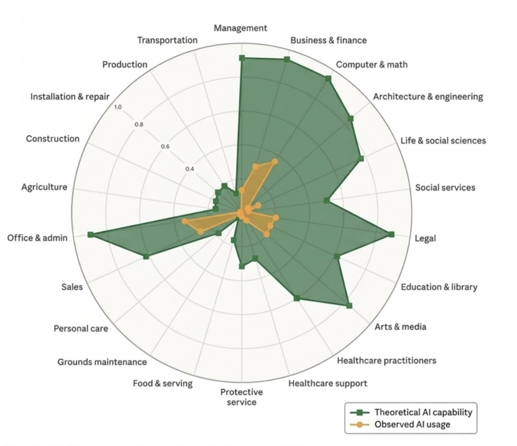 Anthropic researchers published a detailed map of AI job displacement risk, measuring the gap between what AI can theoretically do and what it is actually doing today. Financial analysts, programmers, and sales reps top the exposure list. Here is what it means for your portfolio.